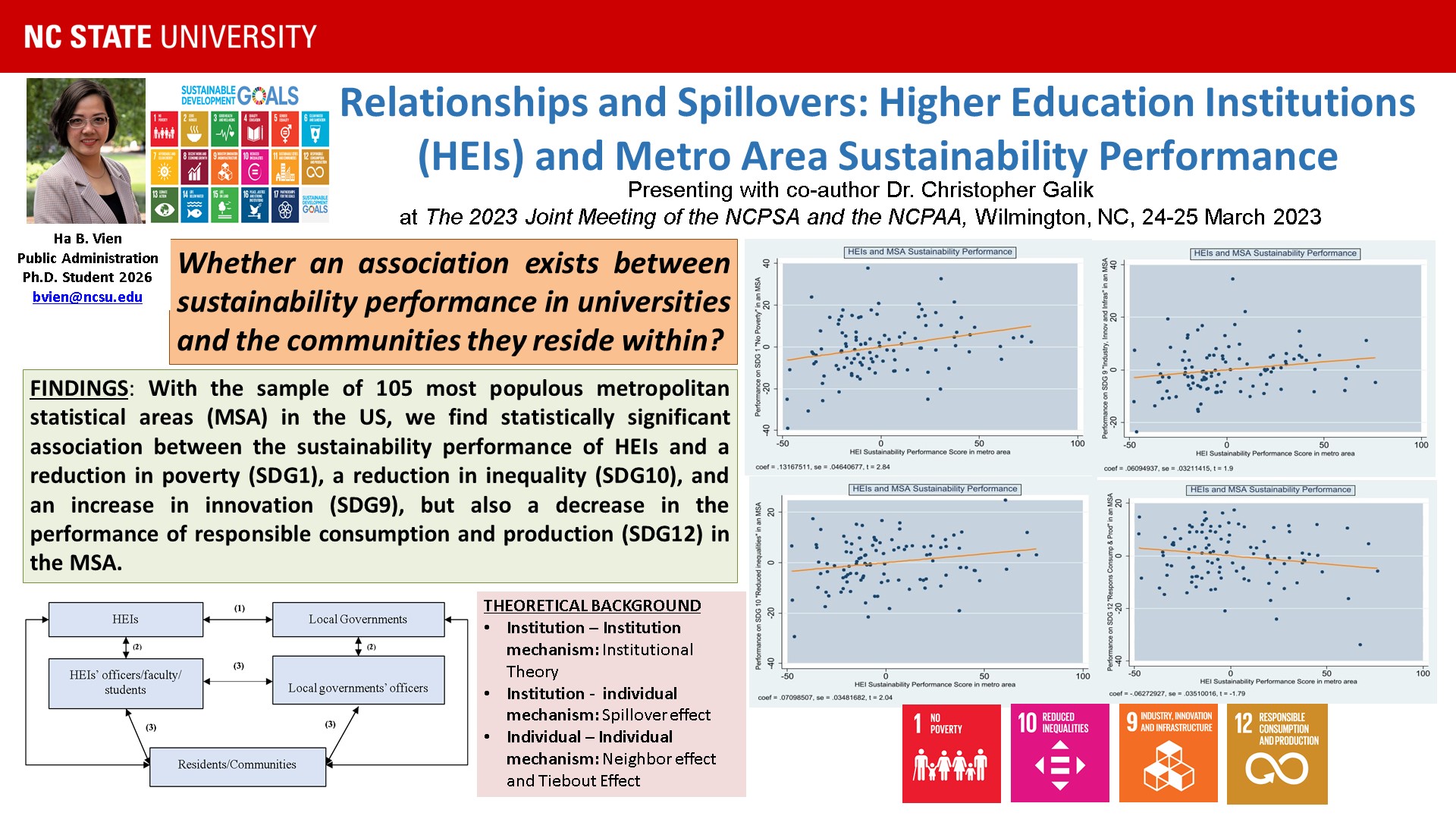 Vien, Ha B. and Galik, C. (2023). Relationships and Spillovers: Higher Education Institutions and the Adoption of Community Sustainability Practices. North Carolina Political Science Association - North Carolina Public Administration Alliance (NCPSA-NCPAA) Joint Conference. Wilmington, North Carolina, US, March 2023.